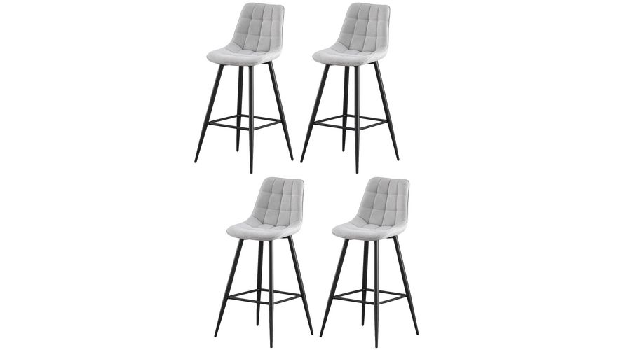 Udoben barski stol z naslonom za noge, na voljo v svetlo sivi ali rjavi tkanini. Blago je prešito z okrasnimi kvadratnimi šivi, ki pritegnejo poglede s preprostim in praktičnim dizajnom.