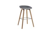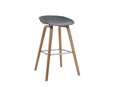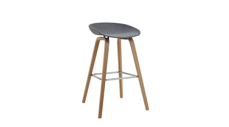 Minimalističen barski stol z izoblikovanim sediščem, oblazinjenim s kakovostno tkanino v sivi barvi. Z rahlo ukrivljenim sedežem in dolgimi, elegantnimi lesenimi nogami ima preprosto, a izrazito vizualno prisotnost, zaradi česar je idealen kot barski stol v različnih poslovnih, javnih in zasebnih kontekstih. Dvodelno podnožje stola je izdelano iz bukovega lesa, v naravni barvni izvedbi. Sedišče je na višini 78 cm. Podnožje stola je povezano s kromiranim naslonom za noge, ki hkrati tudi omogoča dobro stabilnost stola pod obremenitvijo. Maksimalna nosilnost barskega stola je 120 kg.