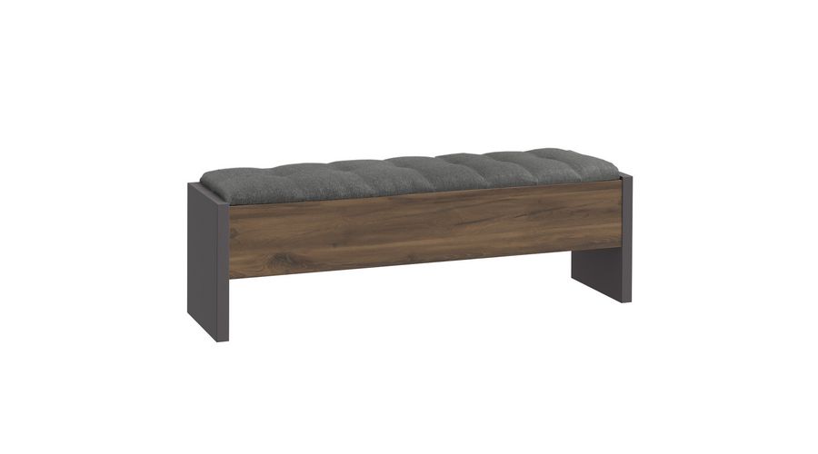 Klop z notranjo shrambo, ki bo odlična dopolnitev vsake spalnice ali predsobe, saj ponuja udobno in estetsko sedišče v kombinaciji temnega hrasta ter sive barve skupaj z diskretnim prostorom za hranjenje vaših stvari.
