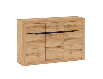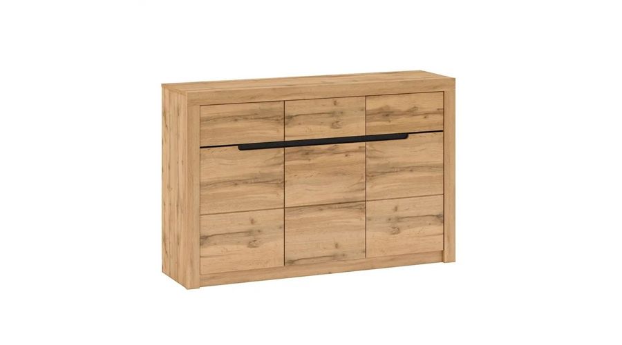 Sodobna komoda s tremi vrati ter tremi enako velikimi predali, na voljo v topli barvi hrasta, primerna za opremo jedilnic, dnevnih sob, spalnic ali predsob.
