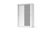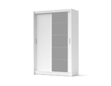 Dvodelna garderobna omara bele barve, z drsnimi vrati in večdelnim ogledalom. Celotna omara je izdelana iz kakovostnega iverala, oblečenega v melamin. V notranjosti je na vrhu po celotni širini polica. Na desni polovici omare je pod to zgornjo polico ena letev za obešanje oblačil, na levi polovici omare pa so še tri ožje police. Te raznolike možnosti shrambe omogočajo, da se v omaro ne pospravlja samo oblačil, ampak tudi druge vsakdanje stvari, odvisno od lokacije, kjer bo omara postavljena, kot npr. garderobna soba, spalnica ali morda predsoba.