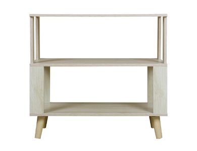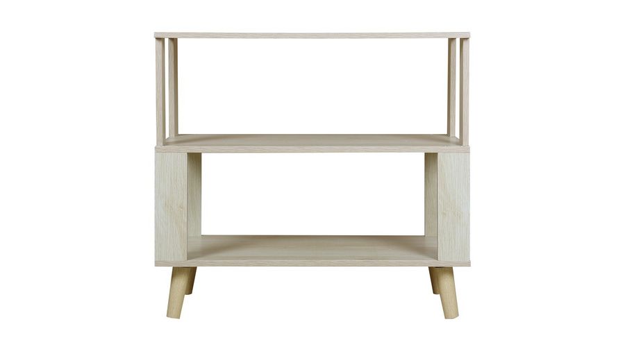 Moderna klubska miza v skandinavskem dizajnu. Njena razgibanost bo odlično popestrila vašo dnevno sobo. Narejena je iz ivernih plošč, oblečenih v melaninsko folijo. Debelina plošč je 1,2 cm. Mizica je sestavljena iz več polic, ki se razgibano vrstijo na vseh straneh, v treh nivojih. Stoji na štirih stilskih lesenih nogicah. Mizica je na voljo v beli in hrast barvi. Največja priporočena obremenitev zgornje plošče je 5kg in polic 2kg.