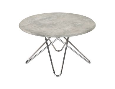 Klubska miza ima okroglo ploščo, debeline 17 mm, narejeno iz MDFa, opaščenega v folijo v sivi cementi barvi in kromirano kovinsko podnožjem zanimive oblike. Premer podnožja: 64 cm.