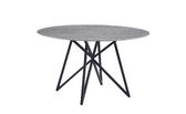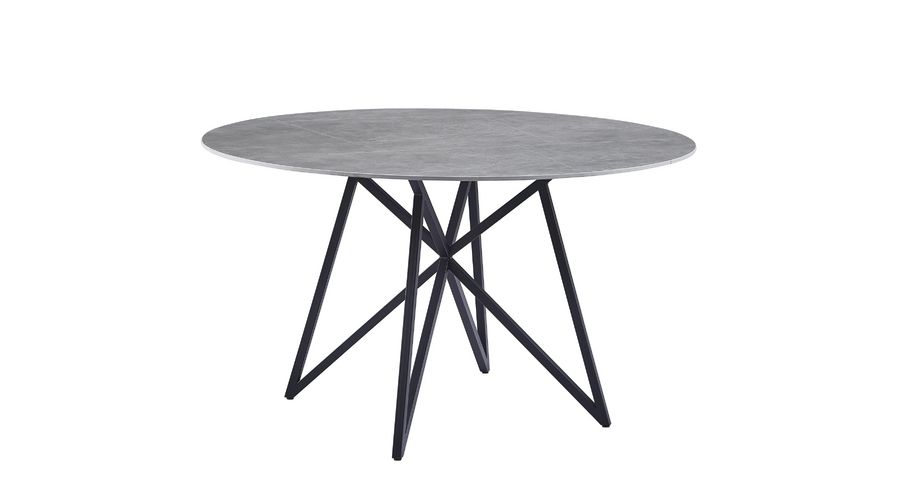 Okrogla jedilna miza, s čudovitim vzorcem sivega marmorja. Plošča mize je izdelana iz sintranega kamna, v mat sivi Armani barvi, in je debela 12 mm. Sintrani kamen je narejen iz kombinacije naravnega kamna v različnih barvah in ima več prednosti pred navadno keramiko. Je močnejši od velikih keramičnih plošč in se ne razbije zlahka. V primerjavi s ploščami iz naravnega granita pa je tudi naravno vodoodporen. Prav tako je okolju prijaznejši od kemično obdelanih kremenčevih plošč. Celotna plošča je debela 12 mm in ima premer 133 cm. Podpora namizja je izdelana iz MDF materiala. Razgibano podnožje mize je narejeno iz kovinskih cevi in za boljšo zaščito prašno lakirano v črno barvo. Maksimalna nosilnost mize je 120 kg.