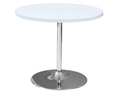 Preprosta jedilna miza okrogle oblike. Plošča mize je narejena iz MDF materiala v beli barvi z visokim sijajem. Kromirano podnožje pa je kovinsko. Debelina plošče je 3 cm.