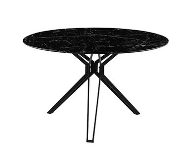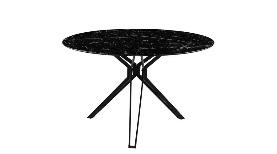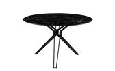 Okrogla trendovska jedilna miza na voljo v marmornati barvi. Mizna plošča je narejena iz kaljenega stekla, debeline 0,8 cm v čudoviti črni barvi z marmornatim vzorcem. Kovinsko podnožje mize je debeline 0,12 cm in prašno lakirano v črno barvo. Maksimalna nosilnost mize je 50 kg.