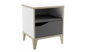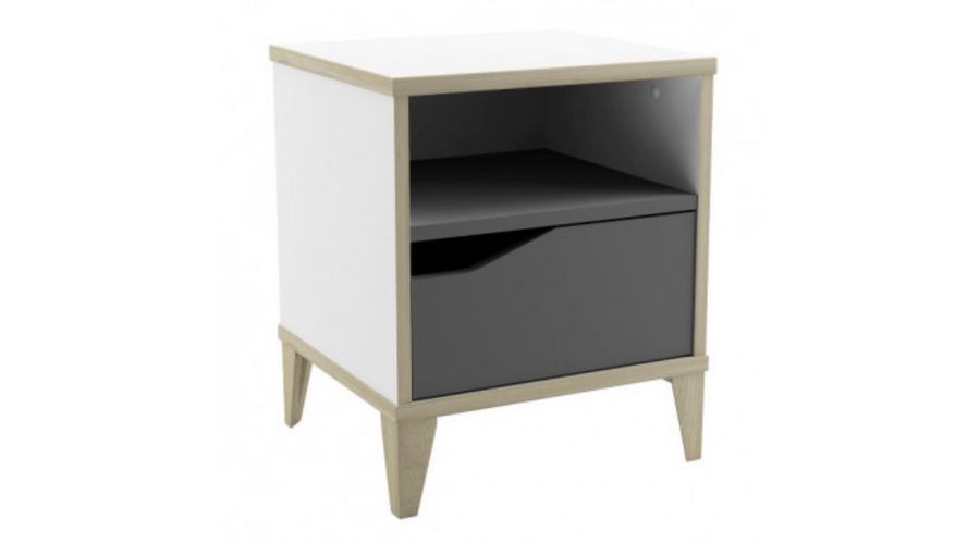 Nočna omarica narejena v skandinavskemu stilu z dvignjenimi nogicami v barvi lesa in stožčasti obliki. Isti lesni dekor se nadaljuje tudi na vseh vidnih robovih omarice. Ohišje je v prevladujoči beli barvi. Nočna omarica izstopa z sivimi vratci predala, ki ima na zgornjemu levemu robu zaokrožen izrez, ki nadomešča ročaj. Predal ima kroglična vodila. Nad predalom se nahaja odprta polica. Zgornja pokrivna plošča je debeline 18 mm. K omarici lahko kombinirate tudi druge elemente iz iste linije.