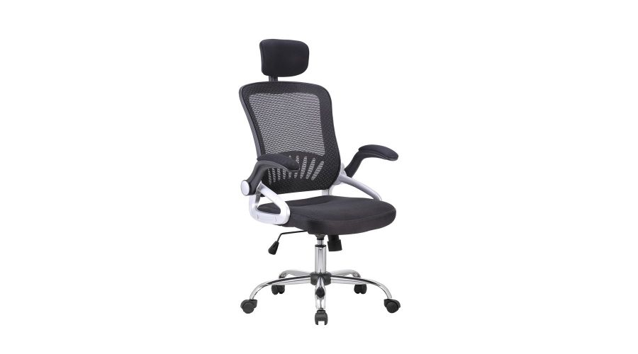 Modern pisarniški stol narejen iz črne tkanine in črne mreže. Podnožje je kromirano z plastičnimi kolesci. Je vrtljiv in nastavljiv po višini, z oblazinjenimi rokonasloni ki se jih da nastaviti po višini, gor ali dol. Velikost naslona je 49x68cm, velikost sedišča 50x51cm in višina sedišča je nastavljiva med 46-56 cm. Maksimalna nosilnost stola: 120 kg.