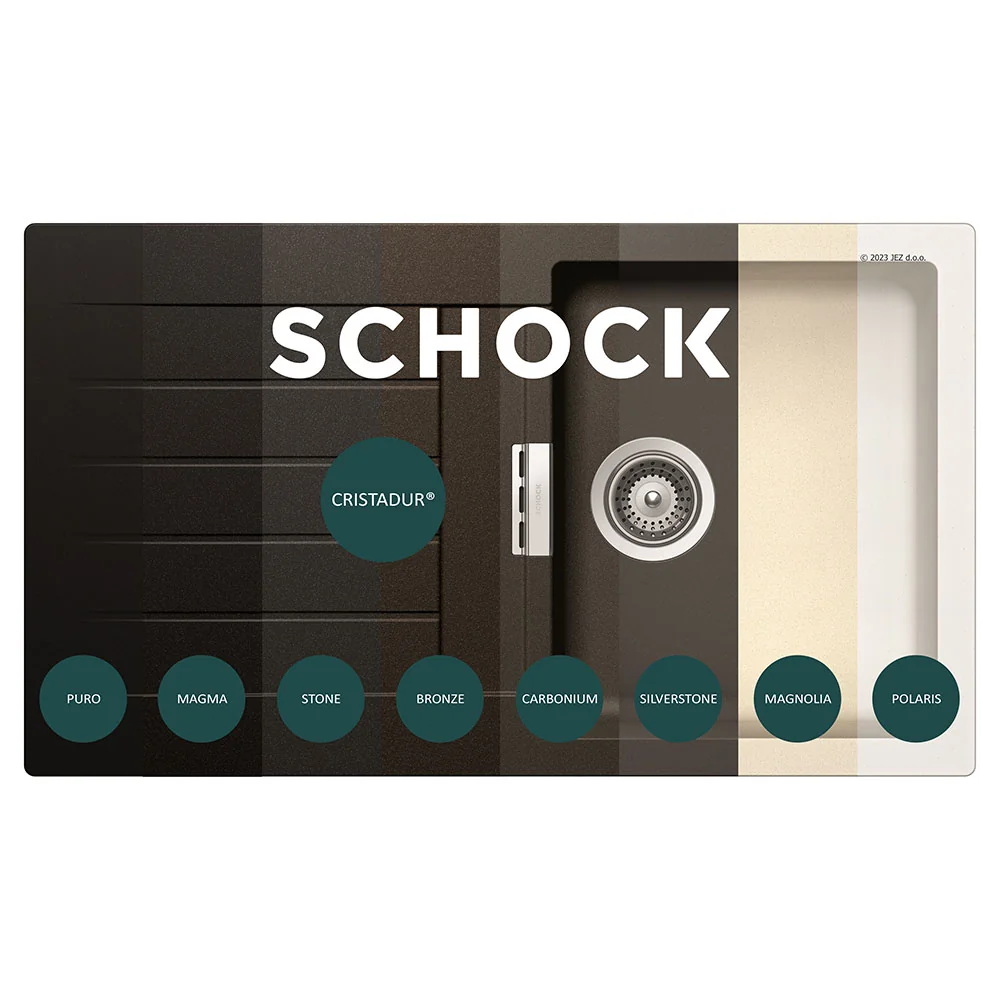 Pomivalno korito SCHOCK Signus D-100 je zasnovano kot preprosto, a simpatično korito. Dobavljivo je v tej svetli barvi Magnolia, prav tako pa še v sedmih drugih barvah prestižne linije Cristadur®. Signus je brezčasno in elegantno pomivalno korito, kateremu lepo pristaja kuhinjska armatura SCHOCK Nimbus.