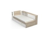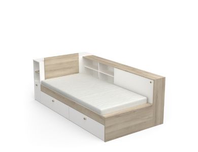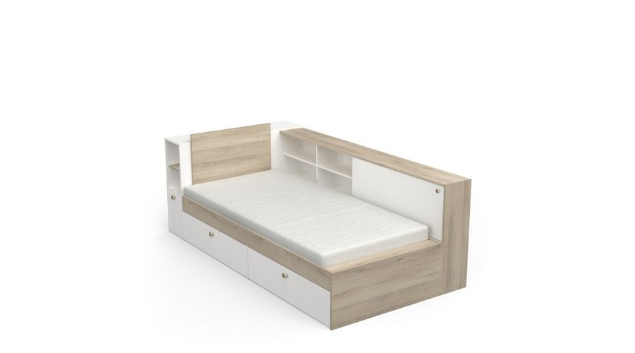 Praktična postelja z več policami ter predali, izdelana v Franciji. Narejena je iz iveralnih plošč, debelin 1,5 cm ter 1,8 cm, oblečenih v melamin papir z dekorjem kronberškega hrasta ter mat bele barve. Kompatibilna je z vzmetnicami velikosti 200x90 ali 190x90 cm ter ima maksimalno nosilnost do 100 kg. Postelja je opremljena z več policami ter dvema predaloma na valjčnih ležajih, dimenzij 94,9x33,7x14,6 cm ter nosilnostjo do 9 kg. Postelja se lahko po želji montira v levi ali v desni postavi. Vzmetnica in letveni okvir za posteljo nista vključena v nakup!