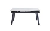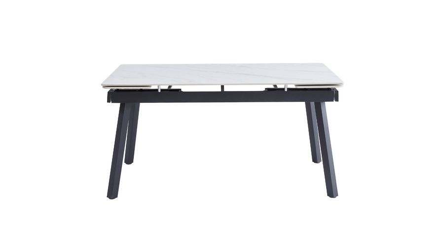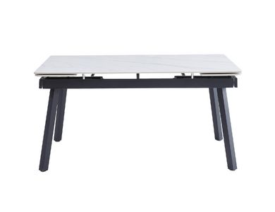 Velika raztegljiva miza v beli Snow barvi z visokim sijajem, na voljo v več različnih velikostih, ali v imitaciji hrasta. Vsaka mizna plošča ima dva 30 cm podaljška, ki se s preprostim mehanizmom raztegneta iz stranic mize. Plošča in njeni podaljški so debeli 1,2 cm, s prijetno zaobljenimi robovi, in so narejeni iz sintranega kamna sijoče bele barve, s prelepim vzorcem marmorja.