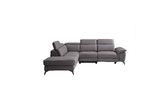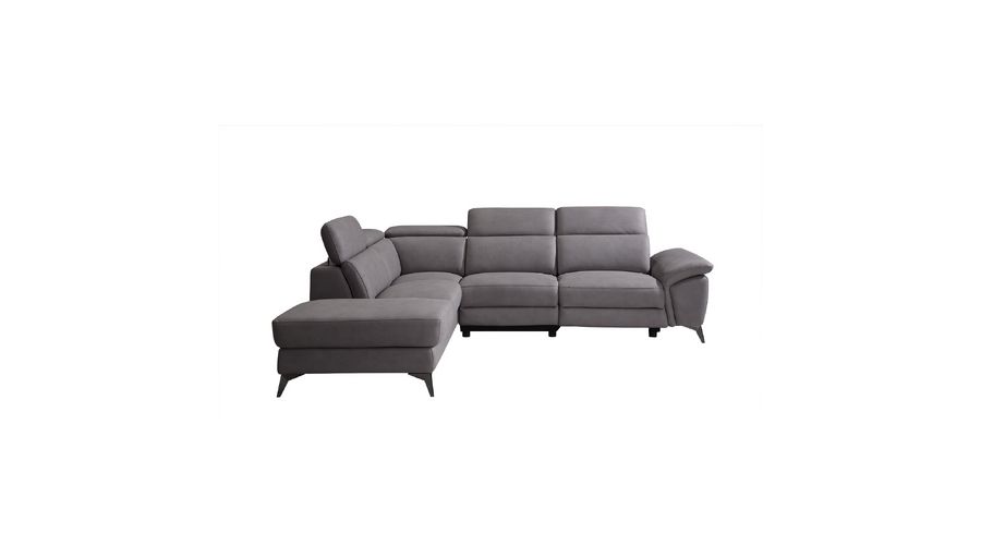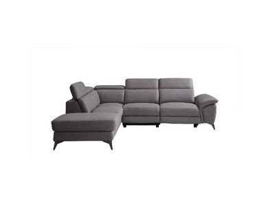 Velika sedežna garnitura, na voljo v bež ali sivi barvi, izbirate pa lahko tudi med levo in desno postavitvijo. S svojo L-obliko se prilega v kot vaše dnevne sobe in je v celoti debelo oblazinjena s trpežno tkanino. Okvir garniture je izdelan iz lesa, sedeži so napolnjeni s peno visoke gostote za udobnejše sedenje, celotna garnitura pa stoji na kompletu plastičnih in kovinskih nožic. Globina sedišč je 55 cm. Nasloni za glavo so nastavljivi. Garnitura je opremljena s pokritim prostorom za shranjevanje in enim sediščem ki se lahko spremeni v počivalnik. Z dolgim pritiskom na gumb električni mehanizem spusti hrbtni naslon ter dvigne in raztegne oblazinjeno naslonjalo za noge. Maksimalna obremenitev garniture je 120 kg na posamezen sedež.