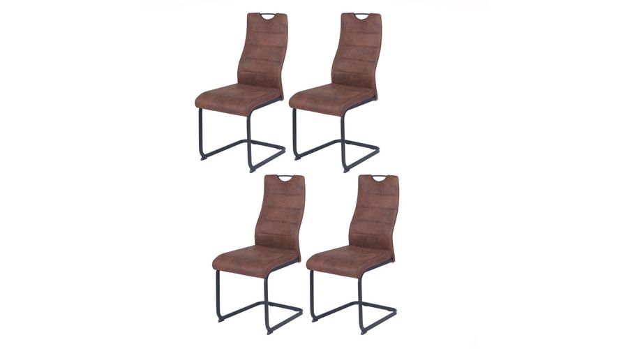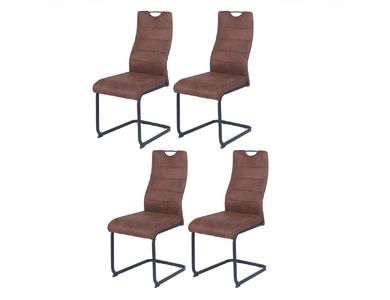 Modern jedilniški stol, ki ima sedišče in hrbtišče v celoti oblazinjeno s kvalitetno tkanino v rjavi ali temno sivi barvi. Hrbtišče ima vodoravne poudarjene šive v isti barvi, kot je tkanina oblazinjenja. Na vrhu hrbtišča ima tudi priročen ročaj, s katerim lahko enostavno premikate stol. Podnožje stola ima obliko sank, ki so narejene iz kovinskih kvadratastih cevi, dimenzije 1,5x2,5 cm. Podnožje je prašno lakirano v črno mat barvo. Višina sedišča je 47 cm. Maksimalna nosilnost stola je 120 kg.