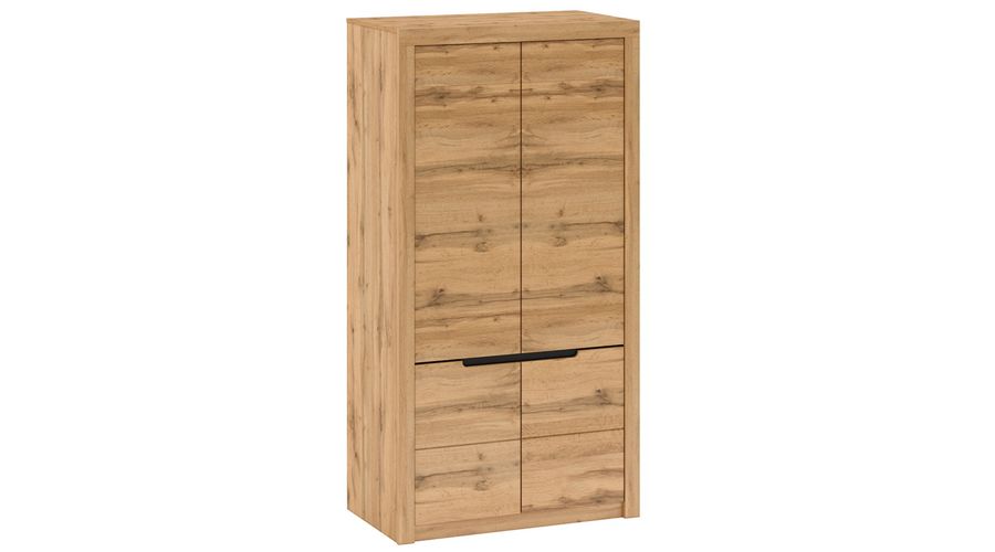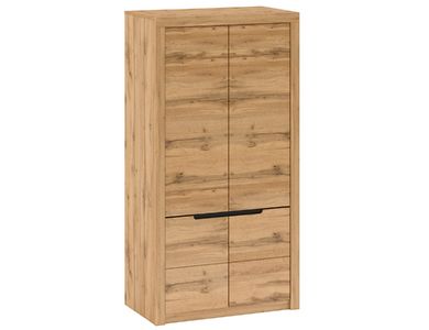 Sodobna garderrobna omara, na voljo v barvi hrasta. Omara je razdeljena na dva dela, manjši spodnji prostor z dvemi vrati ter eno notranjo polico ter večji zgornji prostor, prav tako z dvemi vrati, toda opremljen z obešalno letvijo.