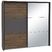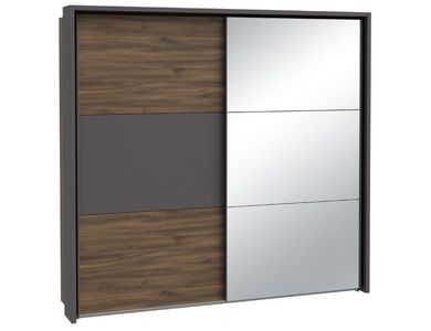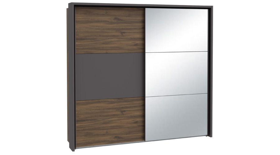 Garderobna omara z drsnimi vrati ter tridelnim ogledalom, na voljo v kombinaciji temnega hrasta in sive barve. Garderobna omara je razdeljena na dva oddelka z vertikalno pregrado.